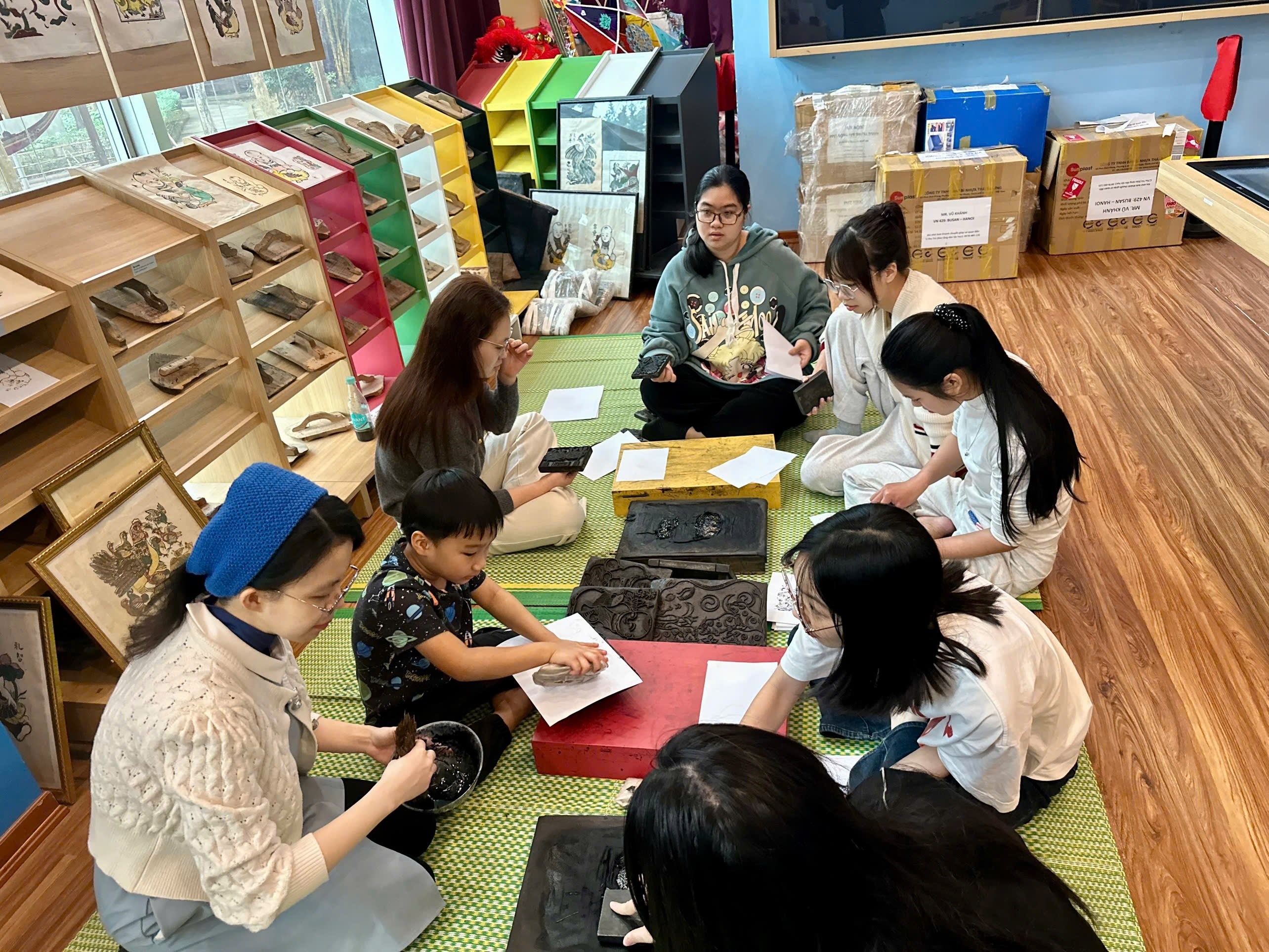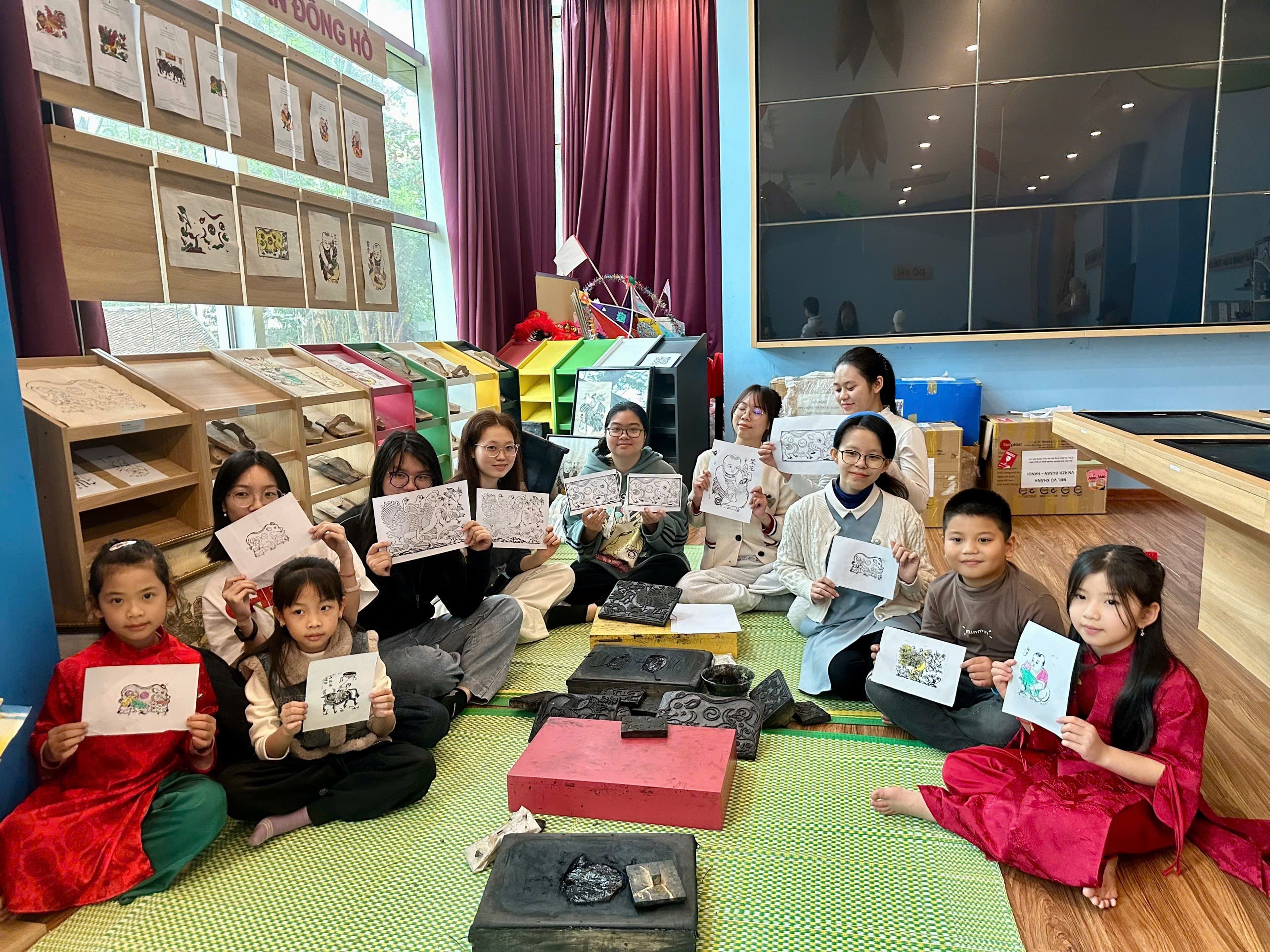 Hoạt động in tranh tại Viện Hàn lâm cũng là sự tiếp nối định hướng giáo dục, lan tỏa giá trị di sản văn hóa của dân tộc tới công chúng. Từ đây, khách tham quan có thể tiếp tục hành trình khám phá dòng tranh dân gian này một cách toàn diện hơn tại Bảo tàng Dân tộc học Việt Nam. Tại tòa Trống đồng, tranh Đông Hồ được giới thiệu trong không gian trưng bày chuyên sâu giúp công chúng có thêm hiểu biết về lịch sử hình thành, kỹ thuật chế tác và giá trị biểu tượng của từng chủ đề tranh. Song song với đó, tại Phòng Khám phá dành cho trẻ em, hoạt động in tranh Đông Hồ luôn là trải nghiệm được nhiều trẻ em yêu thích. Trẻ em không chỉ được tự tay in tranh mà còn được tìm hiểu về nguyên liệu tự nhiên, quy trình in tranh thủ công và ý nghĩa của từng tranh. Từ trải nghiệm ấy, các em hình thành sự trân trọng đối với di sản và ý thức gìn giữ giá trị dòng tranh dân gian truyền thống ngay từ thời thơ ấu.